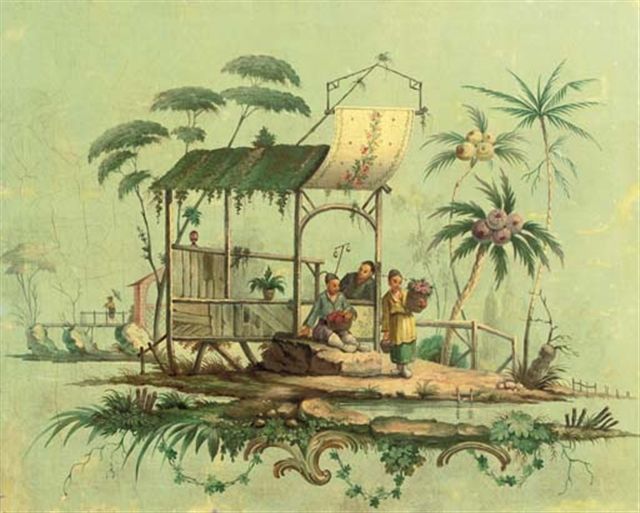 | Chinoiserie: figures holding baskets with fruit underneath a pergola | |