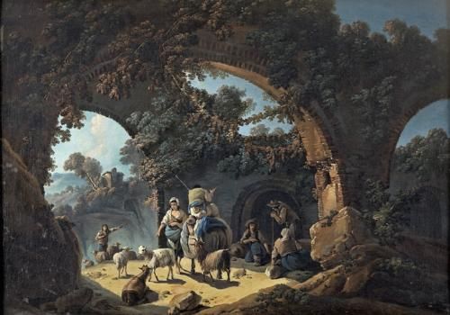 | DES BERGERS ET LEUR TROUPEAU À L'ABRI SOUS DES RUINES DANS UN PAYSAGE | |