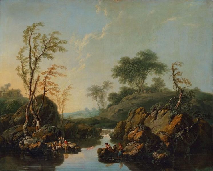 LANDSCHAFT MIT WÄSCHERINNEN, ANGLERN UND HIRTEN