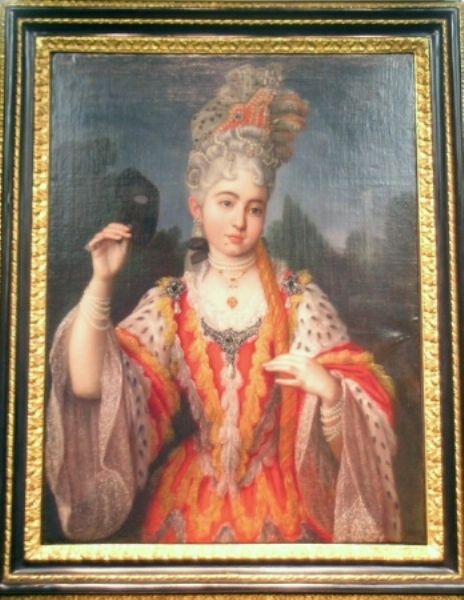 | PORTRAIT OF COUNTESS TORELLI PONIATOWSKI IN A BAL MASQUE COSTUME HOLDING A MASK | |
