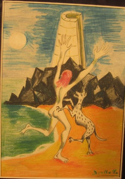 Jeune femme nue attaquée par une bête sur une plage fantastique