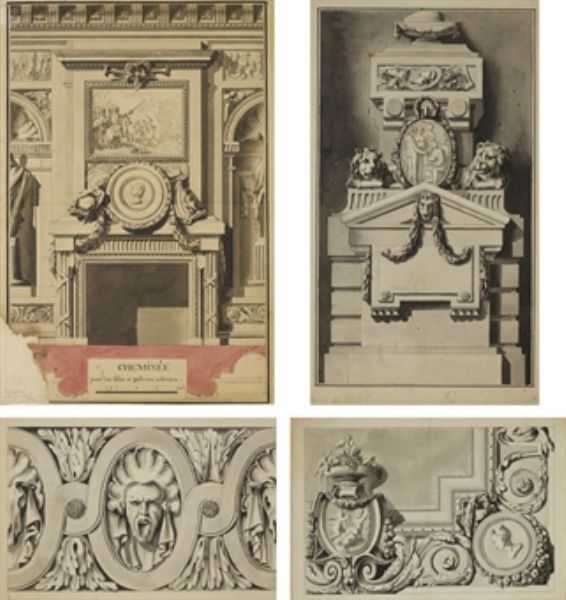 | Ensemble de neuf dessins d'ornement représentant un candélabre, des trophées, des éléments architecturaux, une sépulture | |