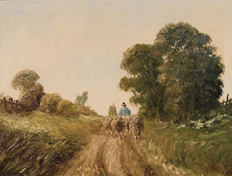 PEJZAŻ Z PASTERZEM I STADEM OWIEC NA DRODZE