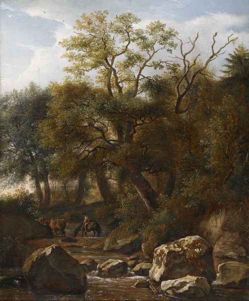Bewaldete Bachlandschaft mit Reiter und Vieh.