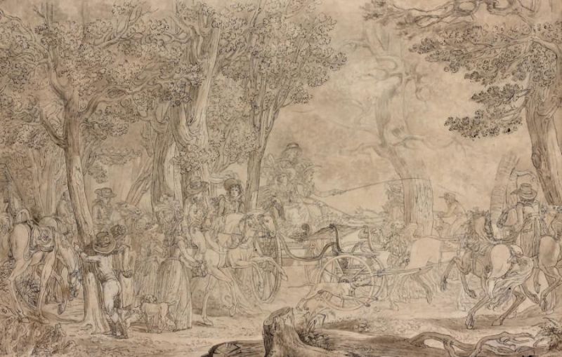 Elégante compagnie en promenade à cheval ou en voiture, dans une forêt
