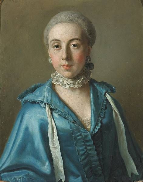 A portrait of a lady with a blue dress and lace collar