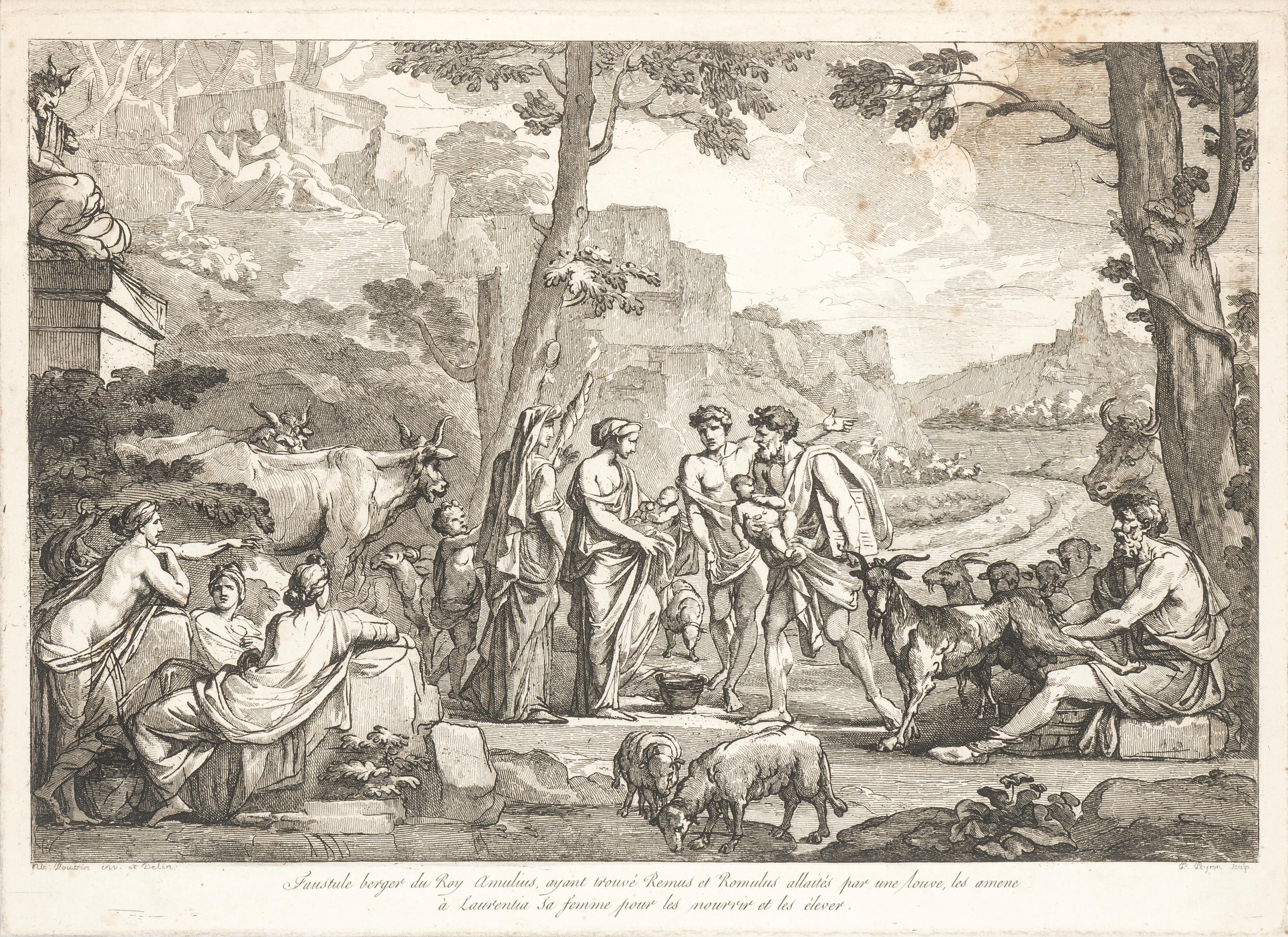 | Faustule berger du roy Amulus ayant trouvé Remus et Romulus allaités par une louve". | |