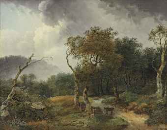 | A wooded landscape with milkmaids and their cattle sheltering from a shower | |