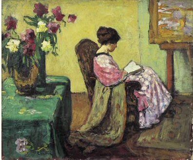 FEMME LISANT DANS UN INTERIEUR, circa 1920.