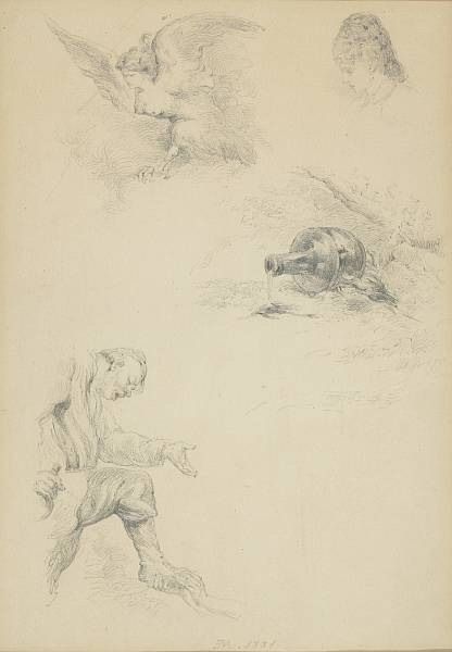 | Studies of a Chimera, woman's head, bottle old sot | |