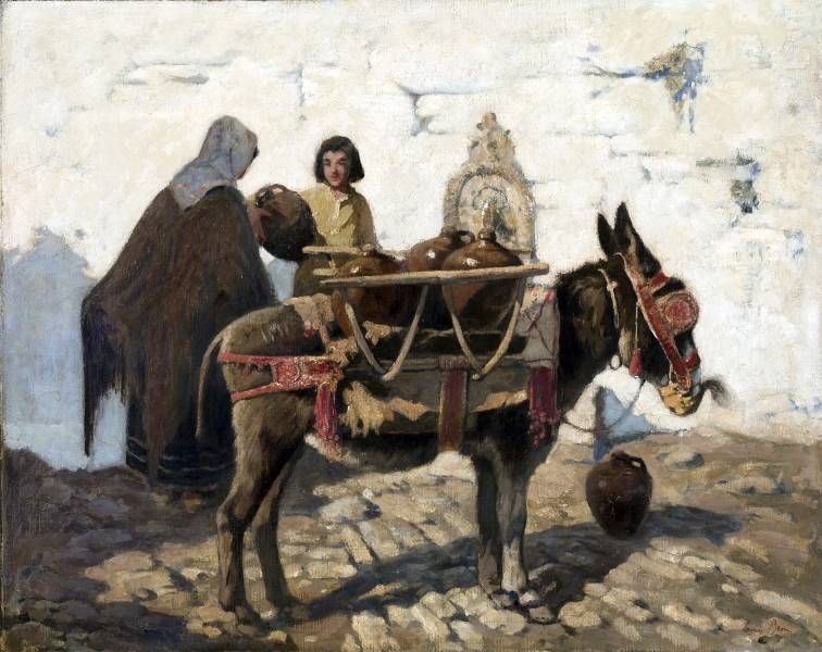 Ezeltje met waterkruiken bij fontein op een Spaans pleintje