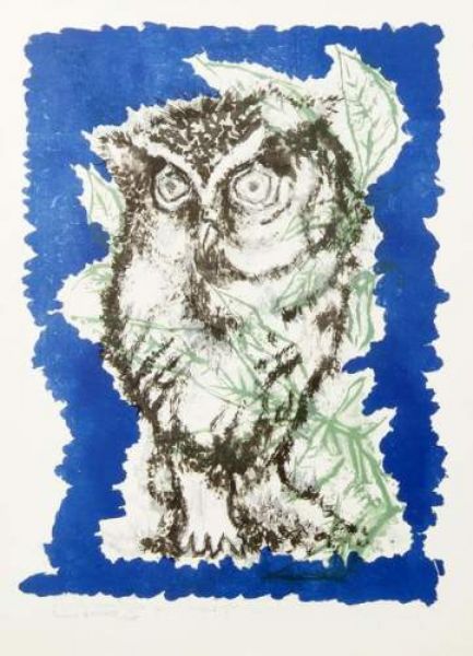 [Grand hibou et feuillages]. Vers 1950.