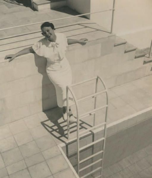 | Juliette debout au bord de la piscine, villa de Reynaldo Luza, Formentor, Majorque, Baléares | |
