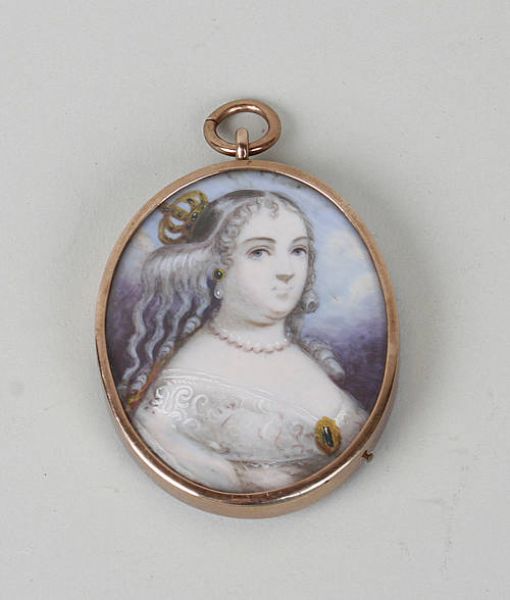 Portrait of a lady with crown and pearls, gilt metal frame.
