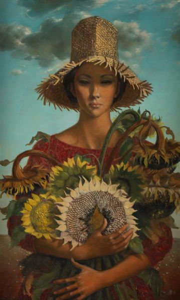 WOMAN WITH STRAW HAT AND SUNFLOWERS