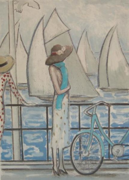 Femmes au vélo devant les voiliers