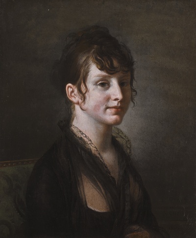 | PORTRAIT OF A LADY, HALF-LENGTH, WEARING A BLACK DRESS WITH A BLACK LACE COLLAR | |