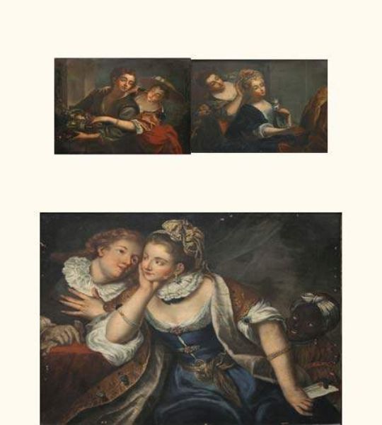 | Couple à la corbeille de fruits : une jeune femme se saisit un fruit | |