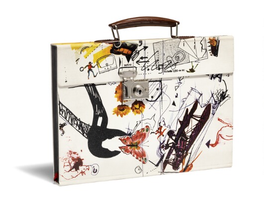 | Unknown Book/suitcase with original signed automate drawing executed by the artist in collaboration with the artist's machine “Meta-Matic No. 6”. Included also a 33 1/3 rpm vinyl record. The suitcase cover by the artist. Tekst by Pontus Hultén. Published by Moderna Museet, Stockholm in connection with the Tinguely exhibition on October 7th-December 3rd, 1972. 31×26 x 3 cm. | |