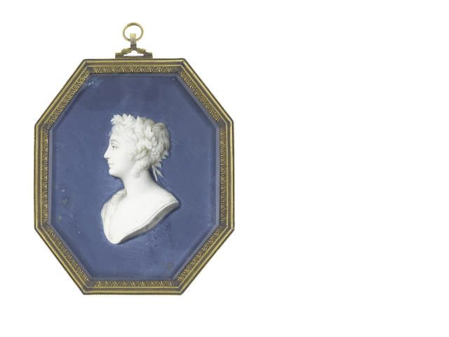 | A bust-length figure of a Lady, in profile to the left, wearing laurel wreath and Classical dress. | |