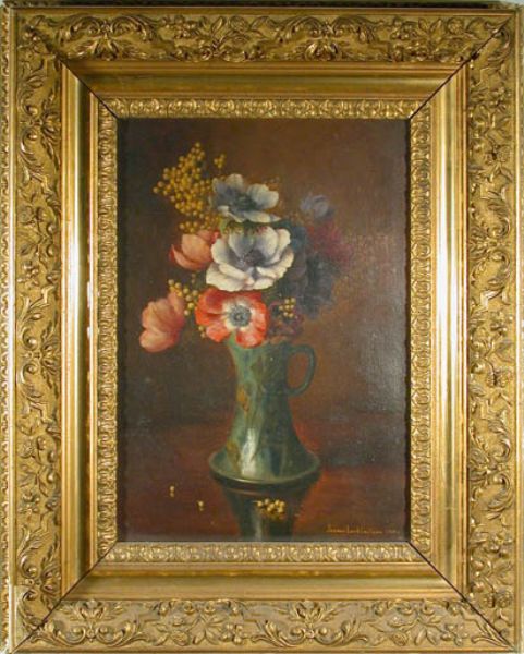 Strauß aus Mimosen und Anemonen in einem Jugendstilkrug