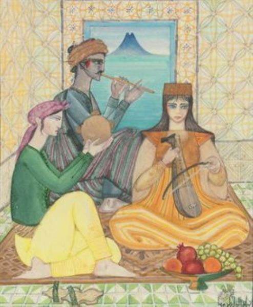 | A group of musicians in an interior with a view of a mountain beyond | |