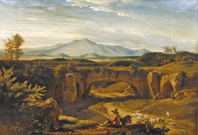 Paysage napolitain animé de paysans et vue sur le Vésuve