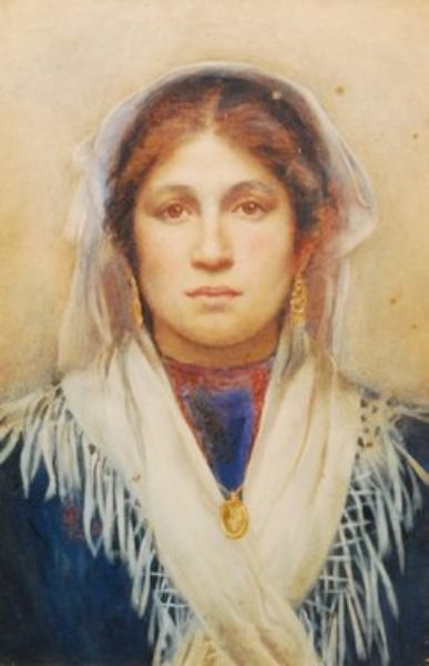 an Italian peasant girl wearing a headscarf and shawl,