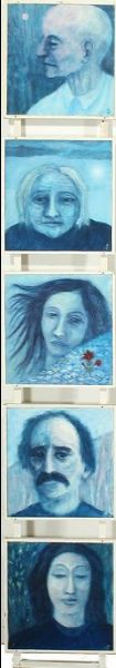 Five portraits in blue colours, mounted vertical.