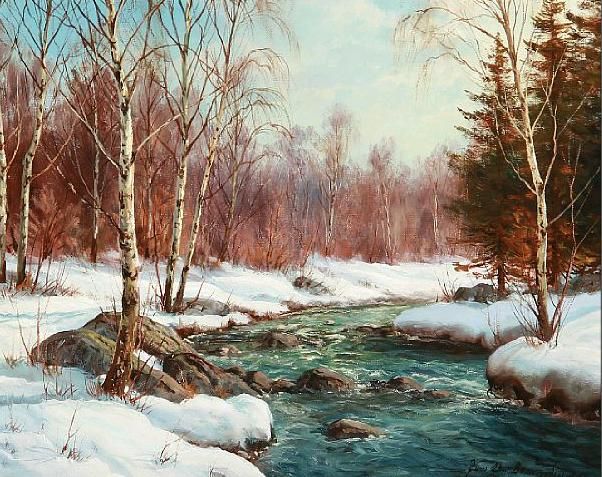 Forest scene with a stream at winter time