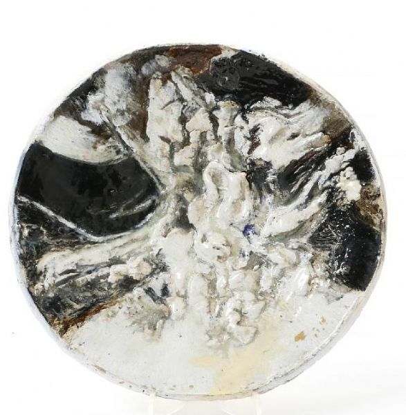 An earthenware disg modelled with patterns in relief
