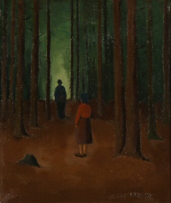 Two figures in the woods