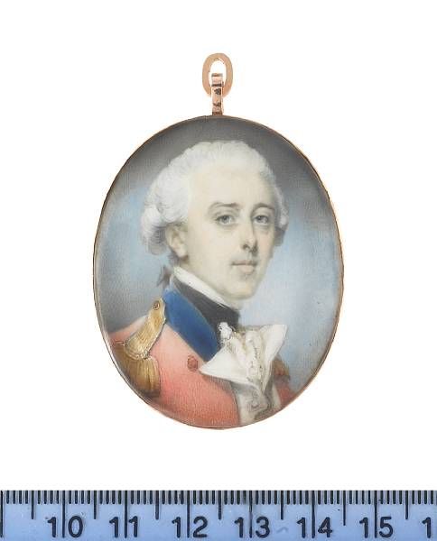 | An Officer, wearing uniform of red coat, blue collar, gold epaulettes, white waistcoat, chemise and black stock, his powdered wi | |