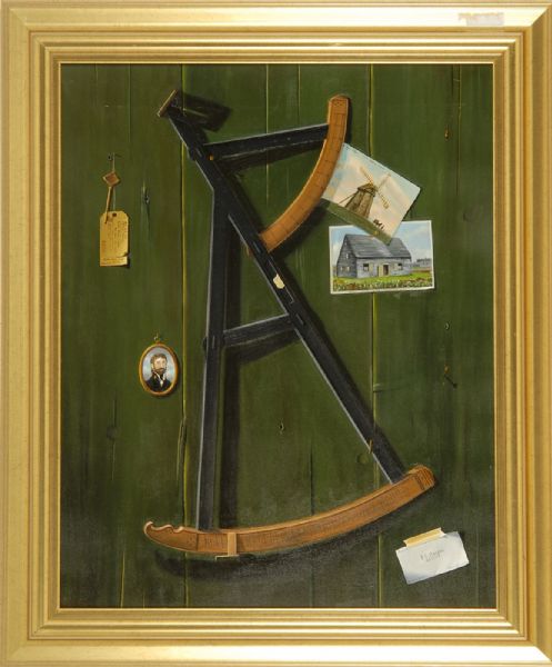 | Nautical trompe l'oeil with quadrant, miniature portrait of a sailor and ephemera relative to Nantucket and Chatham tacked to a | |