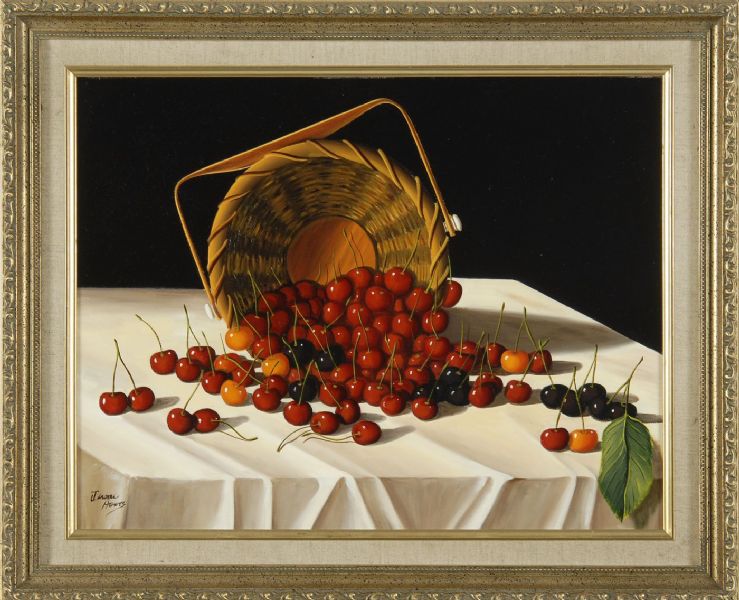 Still life with cherries spilling out of an overturned Nantucket basket.
