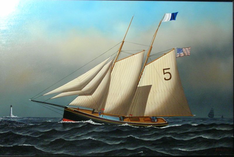 The pilot boat "Sachem" with lighthouse in background