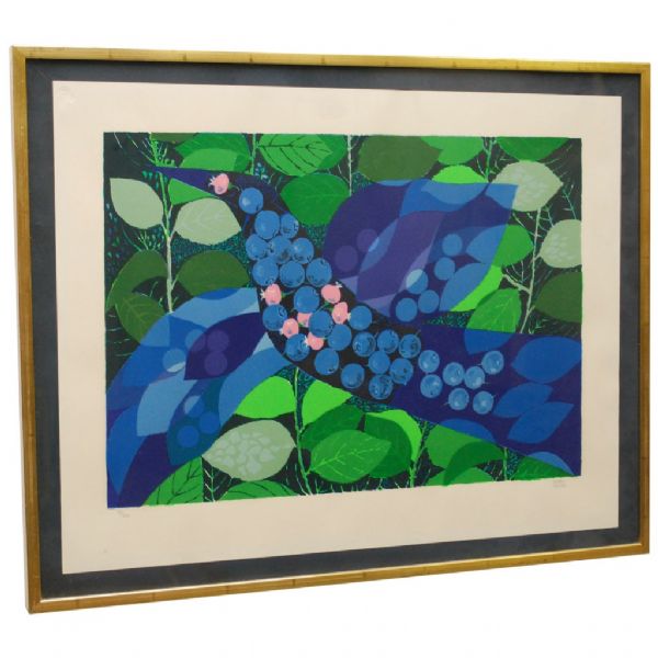Kontur av fågel fylld med blåbär mot bladtät bakgrund.