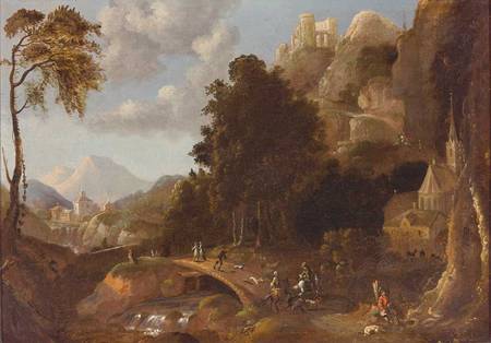 | Southern mountain landscape with castle ruins, hidden church and hunting society on a river | |