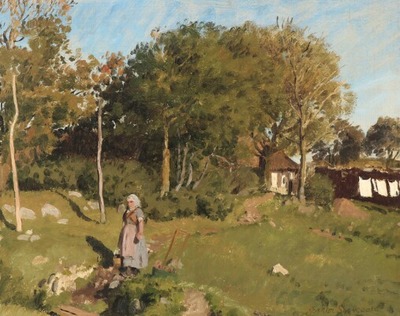 | Landscape with a peasant girl in the garden, in the background clothesline with laundry. | |