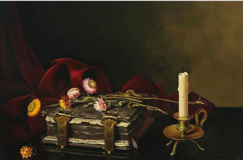 | Still life with a book, a candle and flowers on a table | |