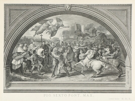 The Encounter of Pope Leo I 'the Great' (d. 461) with Attilla the Hun (c. 406–453).