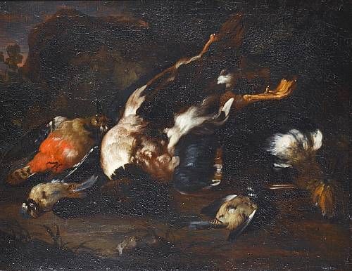A dead mallard, blue-tits, a hooper, and a woodpecker in a landscape