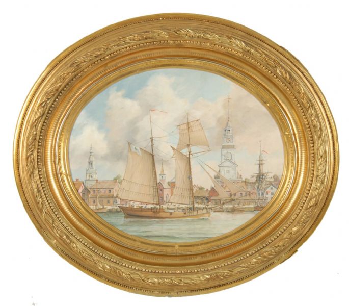 A two-masted schooner at a New England dock with buildings and figures