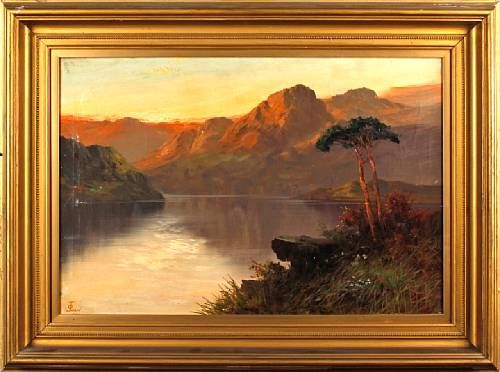 Highland loch sunset; croft by a waterfall