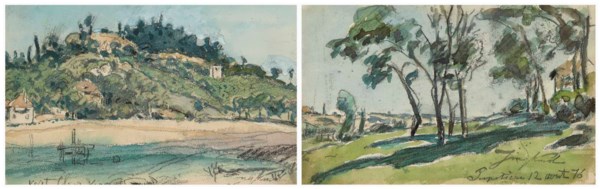 Les quais de Saône à Lyon (recto), Cours d'eau dans un paysage vallonné (verso); et Colline peuplée d'habitations aux abords du fleuve (recto), Vue arborée de Pupetière (verso) | |