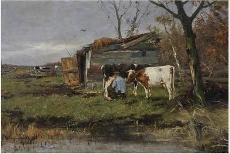 | FARMER MILKING HIS THREE COWS BY AN OUTBUILDING | |