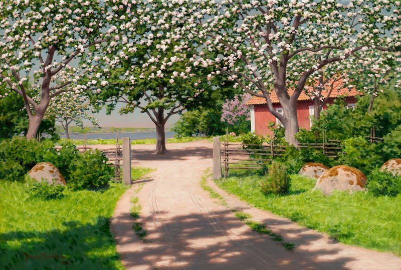 TRÄDGÅRD MED BLOMMANDE ÄPPELTRÄD