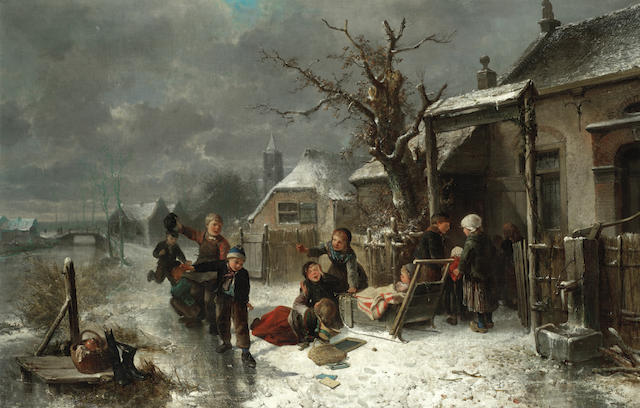 Children playing on a frozen canal