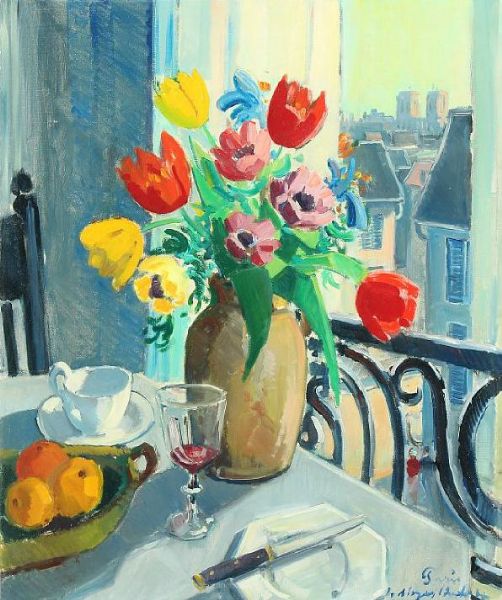 | View of Paris through a window, on the table a bouquet of tulips. | |