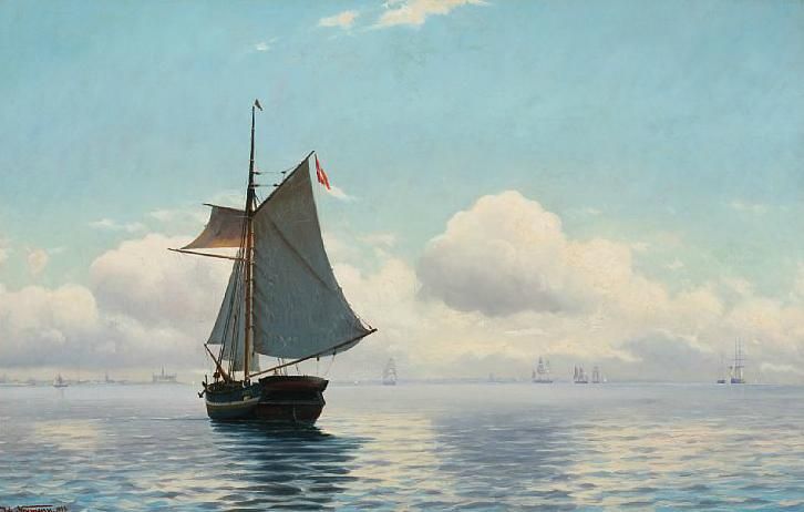 Seascape with sailing ship in calm weather.